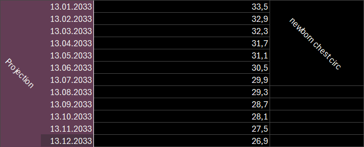 Here, in August 2026 we only just made it barely under the assumed 80cm baseline and it takes until 2033 to reach the chest circumference of newborns.
