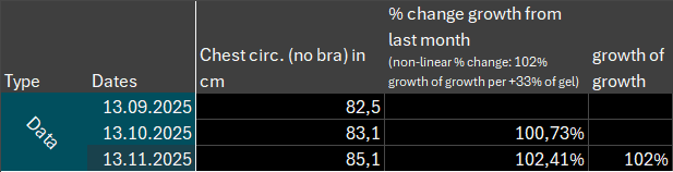 In October I increased from 3→4 pumps of estrogen gel. While I don’t have access to data from counterfactual worlds, we’ll just assume the 102% growth-of-growth stems from the +33% in estrogen gel usage.