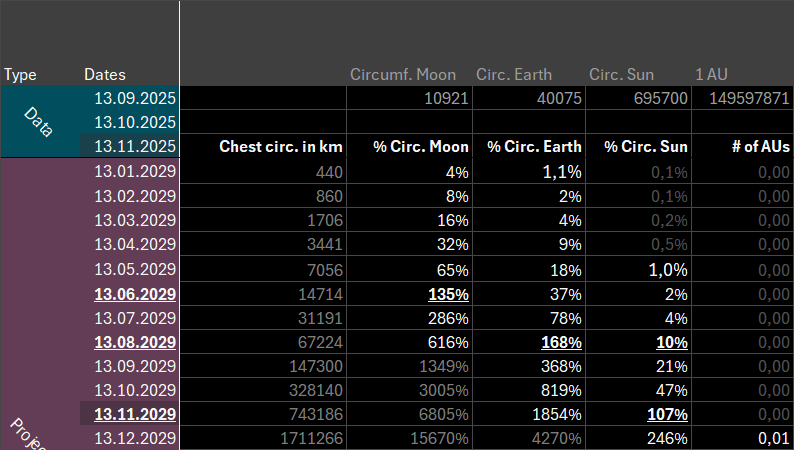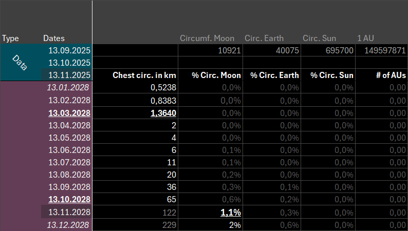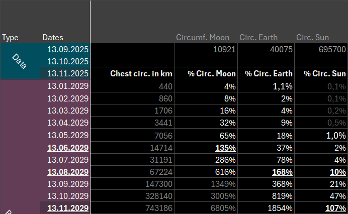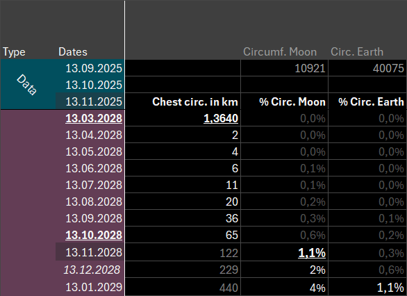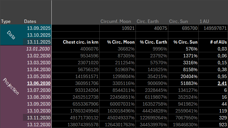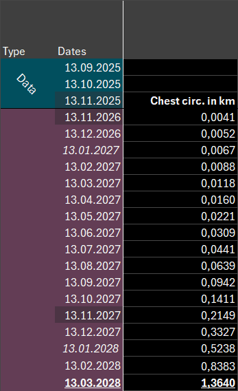 In November 2026, one year from now we’re at 4.1m, but only another year later we’re already reaching 215m, and another 4 months later we’ve breached the first kilometer in chest circumference!
