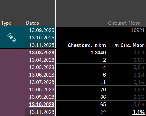 From then on it will us only take until November 2028 (3 years from now) to breach 120km and with that over 1% of our moon’s circumference.