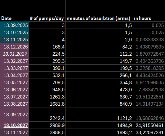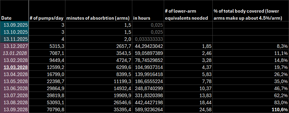 Better. Now we can clearly see that in November 2027 I’d have to cover 1.38 forearm equivalents for 24h/day to keep up w the ever rising demand of estrogen gel intake.