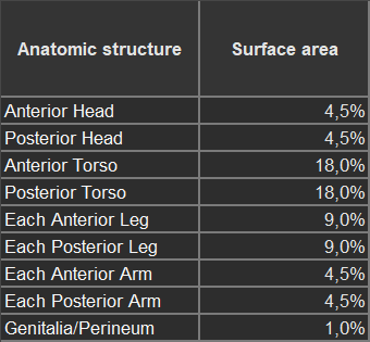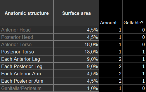 So, this website shows nicely how much surface area each part of the body usually has.